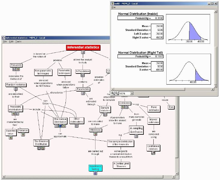 La tecnología actual presenta oportunidades para crear ambientes más poderosos que una secuencia de páginas de Web. Los mapas conceptuales, como se mostró en la Figura 4, permiten al estudiante navegar a través de los mapas y los medios según su interés, el tema que está investigando, la pregunta que está tratando de contestar, ó simplemente el orden en que desea estudiar el tema. No existe una secuencia predispuesta para la navegación, como en el caso de un texto lineal. El estudiante puede navegar a través de la jerarquía de mapas hasta un nivel tan profundo como desee y lo permita la subordinación de los mapas. Esto es imposible de lograr mediante un libro de texto. La tecnología nos permite liberarnos de esa estructura lineal. La Figura 5 muestra una versión preliminar del contenido para un curso de estadística aplicada, mediante el cual el estudiante puede navegar e investigar los temas según su interés [11].